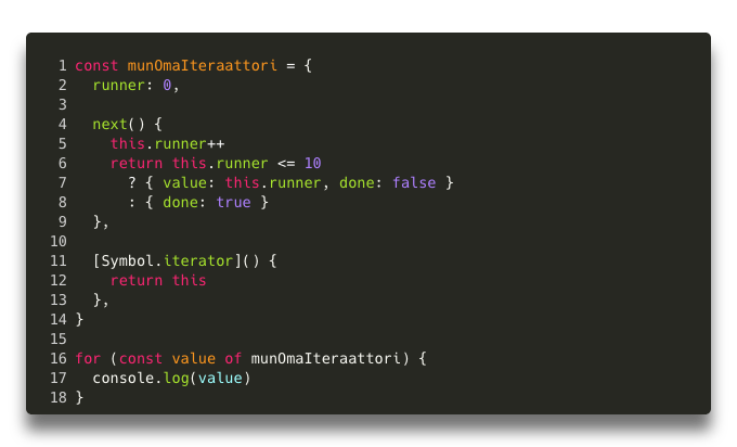 Myös Generaattorifunktion palauttama generaattori on iteroitava objekti, jota for..of-rakenne osaa iteroida. Alla olevassa esimerkissä ei ole genraattoria eikä generaattorifunktiota, vaan iteroitava iteraattoriobjekti manuaalisesti luotuna. Generaattorifunktiot ovat apuvälineitä, joiden ansiosta meidän ei tarvitse luoda iteroitavia iteraattoreita alusta asti, koska generaattorifunktio palauttaa meille sellaisen.